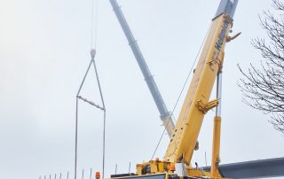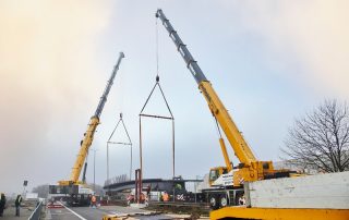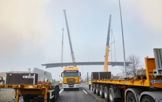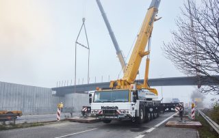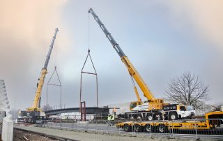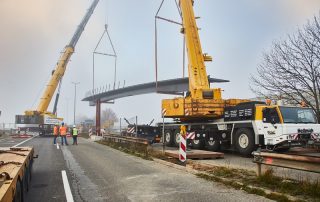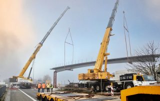 Für das Einheben der Brücke war Hellmich Kranservice mit zwei Mobilkranen vor Ort: Einerseits der 300-Tonner Grove GMK 6300 L mit 92 t Ballast und andererseits der 220 t-Kran Tadano Faun ATF 220 mit 72 t Ballast. Für das präzise Platzieren war ein Tandemhub notwendig. Nachdem die Krane platziert und aufgerüstet waren, konnte die Brücke mit 40 m Länge, 5 m Breite und einem Gewicht von 65 t an die Haken genommen werden.