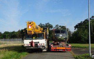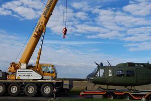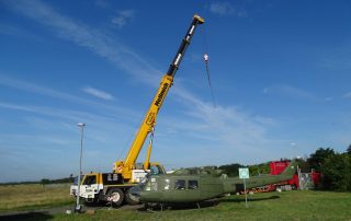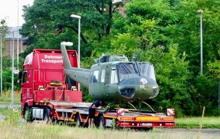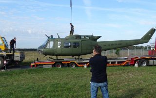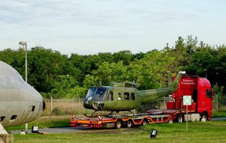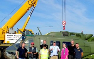Auf Spendenbasis haben wir am Mittwochmorgen den 11.08.2021 eine „Huey“ des Typs Bell UH-1 auf ihren neuen Ausstellungsplatz im August-Euler-Luftfahrtmuseum in Giesheim verhoben. Hier soll sie künftig an die Geschichte des Flugplatzess erinnern, der nach dem Zweiten Weltkrieg von der US-Army mit Hubschrauberstaffeln genau dieses Typs Bell Uh-1, genannt „Huey“ besetzt war. Die Maschine, die von einem Vereinsmitglied in Österreich entdeckt wurde, ist und wird nicht mehr flugfähig sein. Die Rotorblätter mussten für den Transport abmontiert werden. Auf dem ehemaligen Flugplatz soll der Hubschrauber wieder zusammen gebaut und nach Absprache mit der TU-Darmstadt der Öffentlichkeit präsentiert werden.