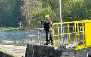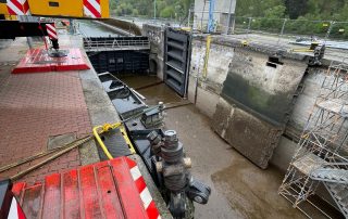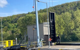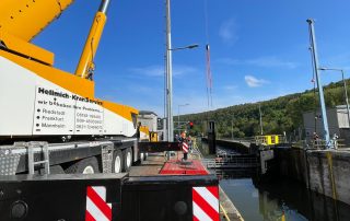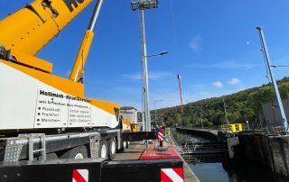 Wir haben im April wieder eine jährliche Schleussen-Wartung mit unseren Kranen unterstützt. Ohne Wartung ist die Funktion der Schleuße nicht zu gewährleisten, somit auch nicht der Binnenschiff-Verkehr. Hier wurden 2 Stück 300t Krane, GMK 6300L mit je 92t Ballast und Zubehör zu Einsatz gebracht. Es wurden temporäre Sperrwende eingesetzt, die Schleusentore herausgehoben, gewartet, Beschädigungen beseitigt und wieder eingehoben. Außerdem wurden diverse andere Komponenten der Schleuße gewartet.