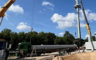 Bei Darmstadt haben wir kürzlich mit 2 Kranen einen Kamin für eine Müllverbrennungsanlage stellen können. Als Hauptkran nutzen wir einen GMK 5120 und als Nachführkran einen HK 4.050. Der Kamin wurde auf einem Telesattel angeliefert, mit beiden Kranen angehoben.