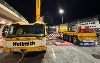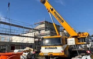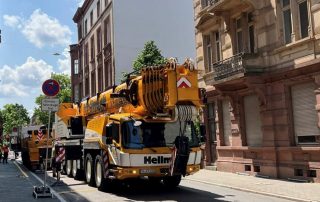 Mainz: In der Uniklinik unterstützen wir die Bauarbeiten beim setzten von Kühlanlagen und Notstromaggregaten. Hier war unser GMK 6300 L1 gefordert, der mit seinem 80m Teleskop und einer 12m Spitze seine Stärken ausspielen konnte.