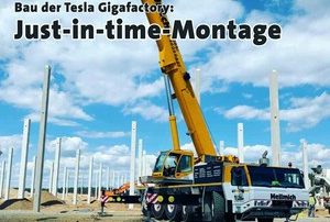 Einsatz beim Bau der Tesla-Gigafactory in Grünheide Artikel aus dem KRANMAGAZIN Ausgabe 136 Einsatzbericht: Bau der Tesla Gigafactory: wenn alles funktionieren muss Tadano ATF 110G-5 und ATF 70G-4 helfen bei der Montage der Megafabrik